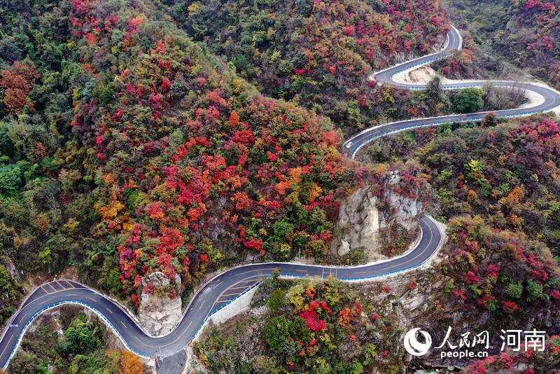 深秋時節,林石公路好像一條彩帶,穿梭于楓葉流丹、層林盡染的太行山脈之間,車行其中仿佛置身於百里畫廊。