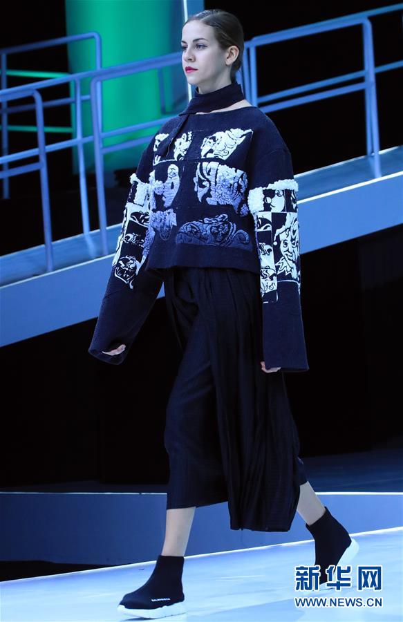 5月13日,模特在時裝發佈會上展示一款大學生設計的休閒裝。5月13日晚,2017中國國際大學生時裝周在北京開幕。 新華社記者 李明放 攝