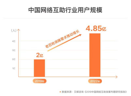 報告認為,網絡互助具有低使用門檻、低成本的優勢,在信用體系保障下,未來三年依舊有較大的發展空間,“預計2022年網絡互助用戶規模將達到4.85億人”。