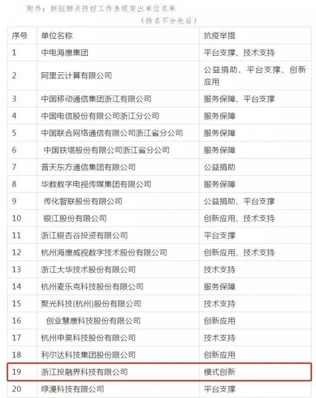 3月18日,浙江省物聯網産業協會發佈公告,對一批在新冠肺炎疫情防控工作中表現突出的單位給予通報表揚。融象控股集團旗下的投融界因在“戰疫情、促發展”工作中的傑出表現,與中電海康、阿裏雲、中國移動等企業一同受到表彰。