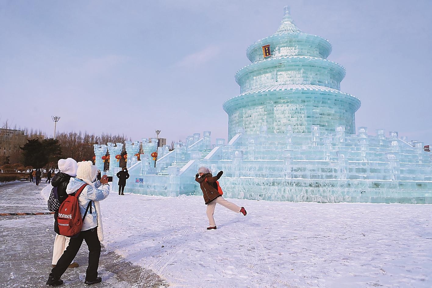 日前,一組組特色冰雕亮相長春新民大街,成為市民新的打卡地。(記者 劉奧琪 攝)
