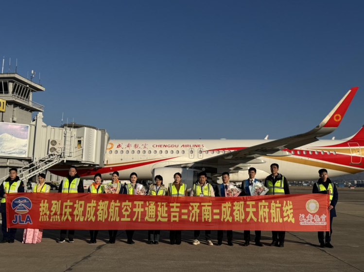 11月22日,成都航空EU1855航班平穩降落在延吉朝陽川國際機場,標誌著延吉=濟南=成都天府航線正式開通。該航線既是延吉機場冬航季換季以來新增的首條航線,也是機場復航後開通的首條新航線,為延邊地區與華東、西南地區架起了高效便捷的空中通道。