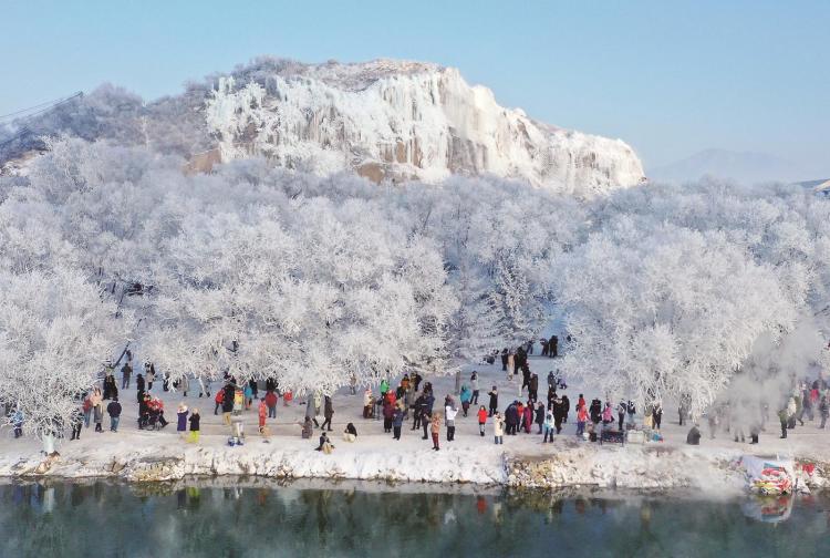 近日,吉林市豐滿區小霧凇島出現大面積霧凇景觀,吸引各地遊客前來觀賞。(楊興國 攝)