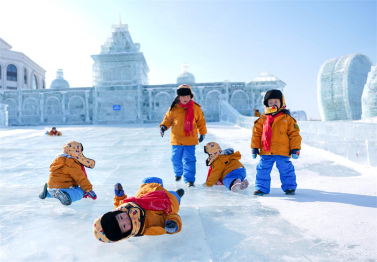 2026年1月14日,“小砂糖橘”在位於吉林長春的長春冰雪新天地玩冰滑梯。 新華社記者 顏麟蘊 攝