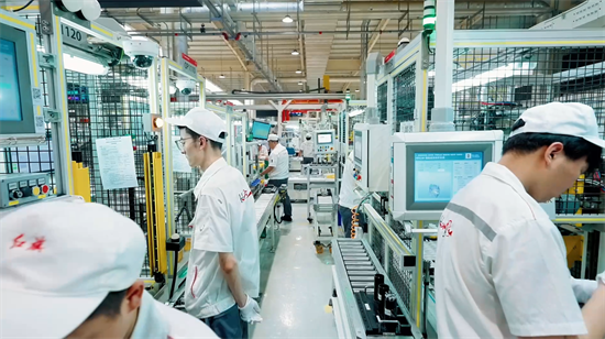 智慧産線上,機械臂精準舞動,AGV小車沿預定軌跡無聲穿梭,一台臺新能源汽車電驅在生産線自動完成裝配。