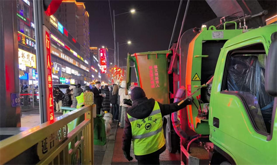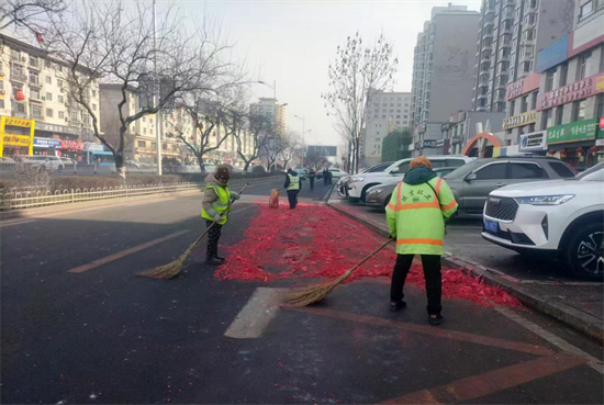天剛濛濛亮,延吉的街頭漸漸有了行人。在車流漸密的主幹道,清運車輛緩緩停靠,環衛工人默契配合,將一袋袋垃圾搬上車;在熱鬧的商圈,身著熒光綠的身影穿梭在遊客之間,及時清理散落的雜物;在老舊小區的巷弄裏,兩名環衛工人正合力清掃成片的煙花爆竹碎屑,紅色的碎屑在掃帚下匯聚,宛如鋪在地上的“紅地毯”。
