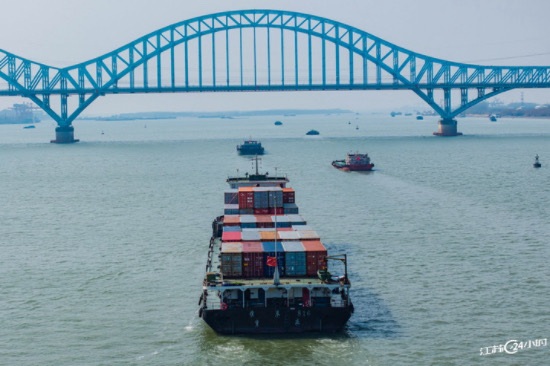 2月5日,長江南京段,裝載生産和生活物資的貨運船舶往返穿梭,有序航行,一派繁忙景象。(交匯點 記者 蔣文超)