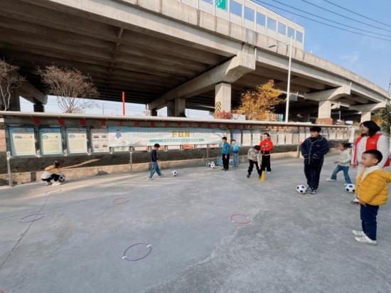 廣場上更是熱鬧非凡。志願者提前佈置好簡易球場,準備了10余個足球、套圈、彩色標誌桶和貼紙、拼圖等獎品,遊戲簡單易操作又趣味十足。孩子們腳踩“西瓜籽”,或靈活帶球避障,或默契配合騰挪“瓜地”,在趣味互動中鍛鍊了身體協調性,更懂得了協作的意義。志願者全程引導秩序,為完成挑戰的孩子貼上小紅花、發放獎品,讓大家在歡樂中感受足球魅力,在協作中體會團隊力量。