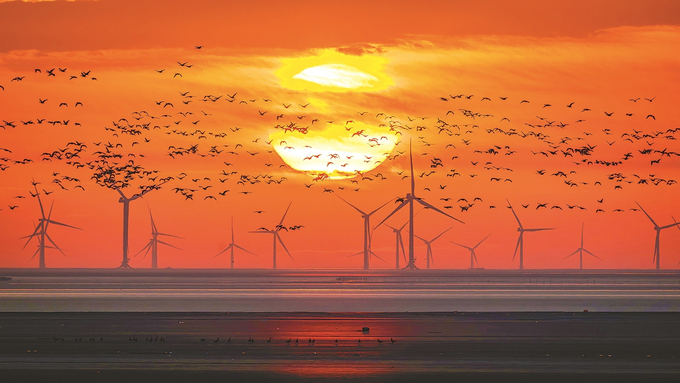 11月16日清晨,鹽城東臺條子泥濕地,大雁與風車共舞。孫華金 攝