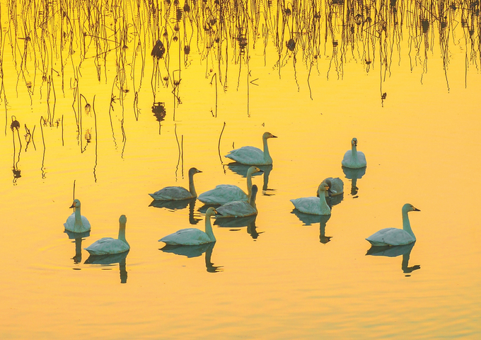 11月30日,一群小天鵝在興化裏下河國家濕地公園內棲息、覓食,成為水鄉冬日一道美麗風景。周社根 攝