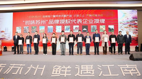 活動現場,蘇州市農發集團董事長俞頌家代表主辦方致辭,提出圍繞“品牌化運營”要進一步打造好的産品、搭建好的平臺、推動好的銷售、形成好的結果,切實把“時味蘇州”打造成蘇州農業的標誌性品牌、鄉村振興的重要載體、城市形象的閃亮名片。市農業農村局副局長宋建華作“時味蘇州”主品牌推介,介紹了主品牌建設的背景意義、主品牌內涵以及未來三年主品牌建設的目標、路徑和藍圖。隨後,市農發集團副總經理張芬就特色農副産品“三進三上”産銷對接活動作專題推介,圍繞進學校、進機構、進企業、上平臺、上連鎖、上商綜,構建從田間到餐桌、線上線下聯動的全鏈條服務體系,推動農副産品産銷對接、優産優銷。同時,活動現場還發佈了首批“時味蘇州”40家授權企業名單,併為神園葡萄、恒洋澳龍、太湖雪、吳儂茶業、迎湖大米、蘇太企業等12家代表企業授牌,通過品牌引領強化聯企帶農成效。
