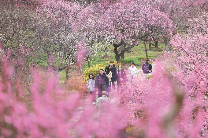 2月25日,素有“天下第一梅山”美譽的南京明孝陵梅花山迎來盛花期。漫山梅花姹紫嫣紅,競相綻放,吸引眾多市民與遊客紛至遝來,賞花拍照。 (新華日報 記者 蔣文超 攝)