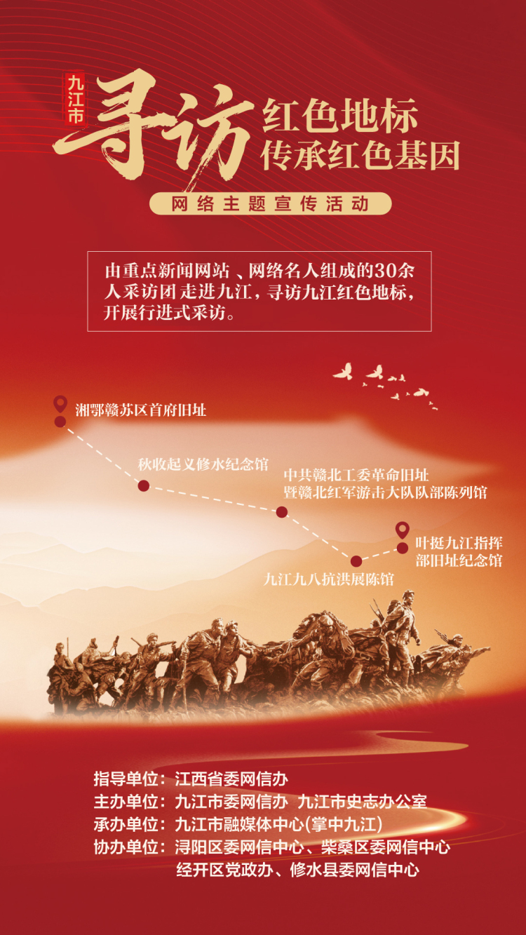 據悉,本次網絡主題宣傳活動為期兩天,採訪團將深入潯陽區、經開區、柴桑區、修水縣等地,從葉挺指揮部的“鐵軍”印記到修水的軍旗榮光,再到蘇區舊址,每一站尋訪都是對歷史的致敬。此次活動將通過一系列深度報道和全媒體傳播,讓更多人走進九江紅色地標,在回望中汲取力量,在傳承中續寫新篇。(文 吳雪倩)