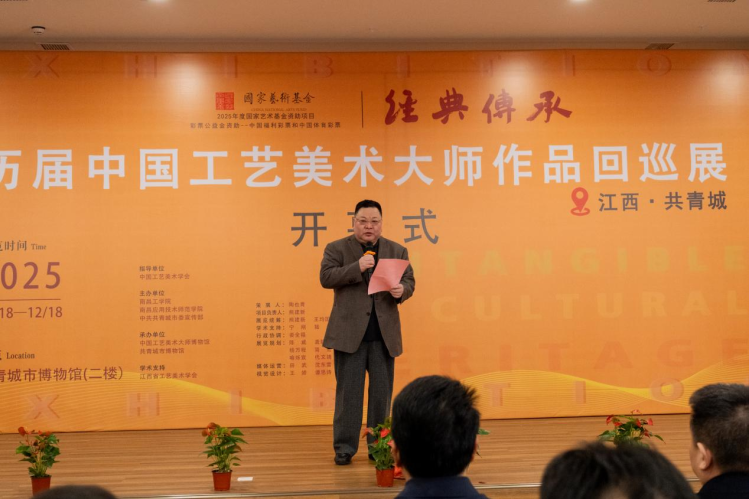 陶也青在致辭中深情回顧了“經典傳承——歷屆中國工藝美術大師經典作品回巡展”巡展足跡。他表示,在國家藝術基金的支持下,這場藝術之旅正生動踐行“讓文物活起來”的時代召喚,讓深藏于館閣的工藝瑰寶走進大眾生活,在傳承中綻放永恒魅力,在創新中鑄就文化自信。他指出,共青城是一座沐浴青春光彩的活力之城,近二十萬市民與十余萬學子共同描繪著時代的畫卷,“我們將展覽帶到此地,正是希望藝術的種子能在年輕的心田生根,讓大師的匠心在校園中延續,使學子們在家門口即可領略百餘位工藝美術大師的精品力作,讓非遺的種子在他們心中生長出對中華文明最深沉的眷戀。”
