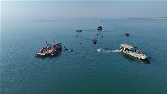 “出征!”平島漁港裏,隨著一聲嘹亮的口號,身著專業裝備的“海碰子”們喝下壯行酒,駕船駛向蔚藍的養殖海域。