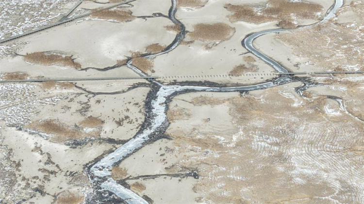從高空俯瞰,這些自然雕琢的“樹木”脈絡分明:冰淩構成粗壯“主幹”,向兩側伸展出層層“枝椏”,纖細的“枝條”上甚至凝結出片片“冰葉”,在陽光下閃爍如鑽石。潮汐在灘塗上沖刷出的溝壑,經連日低溫冰凍,悄然凝固成這般玉樹瓊枝的形態,與遠處蒼茫的紅海灘相映成趣。