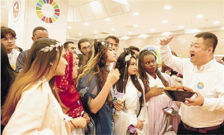 “i”既是英文“in”的縮寫,又與中文“愛”同音,既標注著國際學生“在大連”的生活印記,更承載著他們“愛大連”的真摯情感。本次活動是大連首場商業文旅場景下的中外賀歲聯歡盛會,也是大連高校國際傳播聯盟的新春首聚。來自29個國家的百餘名大連高校國際傳播聯盟成員院校的國際學生代表,在活動中沉浸式體驗中國年俗、共慶新春佳節,在歡聲笑語中深切感受大連開放包容、多元共生的城市魅力與溫暖底蘊。聯歡表演結束後的新春巡遊中,他們有的戴上中國東北特色大花帽,有的把自己裝扮成“財神爺”,沿途向商場內的市民派發糖果、毛巾小熊等新春禮物,將在大連迎新春的喜悅傳遞給每一位路人。