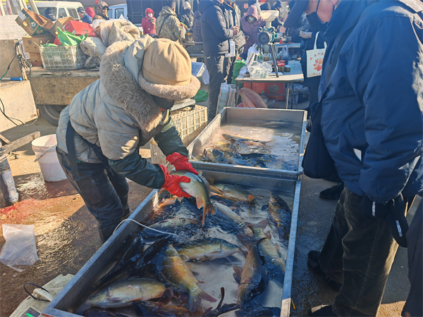 除了新鮮地道的海鮮,大集上的年味元素一應俱全。各類新鮮蔬菜、時令水果、幹貨雜糧、散養土雞讓人目不暇接,炸貨、腌菜等即食産品香氣撲鼻,紅火的燈籠、喜慶的春聯挂滿攤位兩側,將節日氛圍烘托得愈發濃厚。往來群眾手提肩扛,滿載著精心挑選的年貨,在熙熙攘攘的人流中感受獨屬於皮口大集的煙火暖意與新春喜悅。