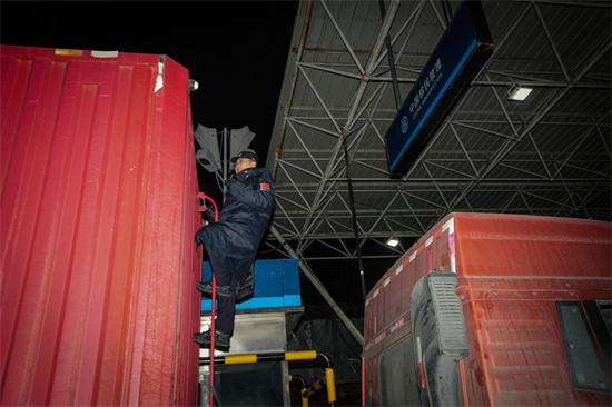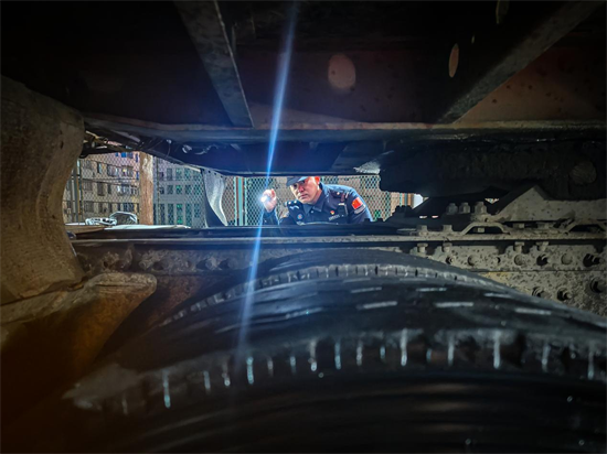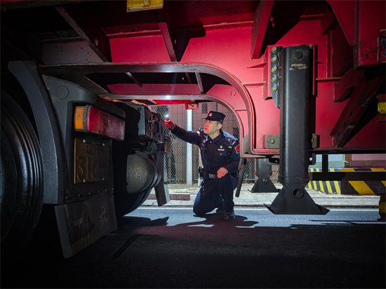 車輛查驗環節,民警俯身貼近車身,借助強光手電仔細檢查車廂、底盤、夾縫等隱蔽部位,手電光束在夜色中來回穿梭。從車頭到車尾,從駕駛艙到貨箱,逐點排查、逐項核驗,對車輛手續、裝載物品、車體結構進行全面細緻檢查,堅決杜絕違禁物品、風險隱患流入流出,用“零疏漏、零差錯”的標準守好國門關口。