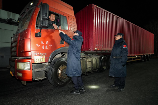 “請出示證件,熄火下車接受檢查。”執勤民警的聲音沉穩有力。在車燈、警燈與查驗燈的交織光影下,民警逐一對駕駛員及隨車人員進行人證對照、證件核驗、信息核查,指尖快速操作查驗設備,雙眼緊盯螢幕與證件細節,不放過任何疑點。寒風中,民警的臉頰被吹得通紅,呼出的白氣在夜色中轉瞬即逝,卻始終保持站姿挺拔、眼神專注。