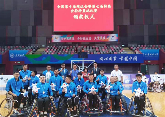年洽成(中)和隊友們在全國第十屆殘特奧會頒獎儀式上合影 受訪者本人供圖