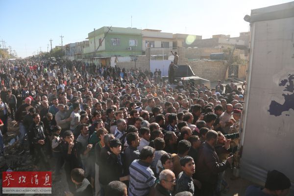 跟著政府軍軍車繼續向西行進10分鐘就到了摩蘇爾市的東大門——古克賈利鎮,站在鎮子內的房屋上可以清晰看到摩蘇爾市區。從市區逃出來的百姓在這裡集合,然後會被轉移到周邊的多個安置營地。