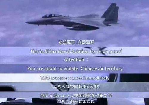 視頻中幾架戰機起飛後,用原音和字幕顯示飛行員之間的通話:“170發現目標”,模擬衛星圖上的坐標為“中國釣魚島”。飛行員分別使用漢語、英語和日語向日方戰機喊話:“注意,我是中國航空兵,你即將進入中國領空,立即離開,立即離開。”