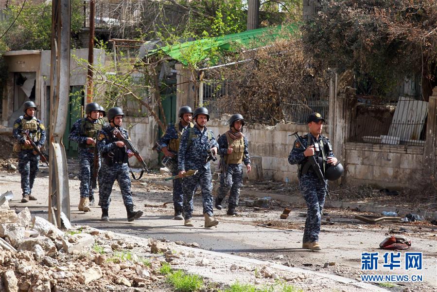 3月29日,伊拉克聯邦警察部隊在伊拉克摩蘇爾西城巡邏。伊拉克武裝力量29日繼續向“伊斯蘭國”組織盤踞的摩蘇爾西部城區發動進攻。由於該地區仍有大量平民滯留且房屋密集、街道狹窄,“伊斯蘭國”武裝分子抵抗較為頑強,伊拉克武裝力量攻勢近來進展緩慢。新華社發(亞瑟爾·賈瓦德攝)