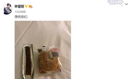 10月8日淩晨,林更新在網上曬出一張零食照,並配文説:“饞死你們。”照片中並不是曬的豐盛美食,只有一根辣條和一個糕點。