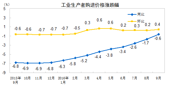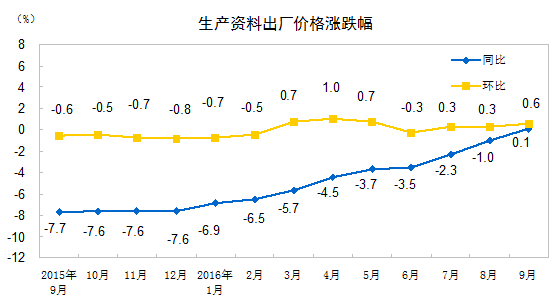 國際在線報道:據國家統計局網站消息,2016年9月份,全國工業生産者出廠價格環比上漲0.5% ,同比上漲0.1% ,同比是自2012年3月份以來首次由負轉正。工業生産者購進價格環比上漲0.4% ,同比下降0.6% 。 1-9月平均,工業生産者出廠價格同比下降2.9% ,工業生産者購進價格同比下降3.8% 。