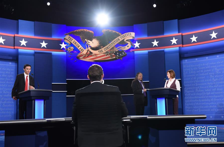10月19日,在美國拉斯維加斯的內華達大學拉斯維加斯分校,工作人員綵排辯論直播。