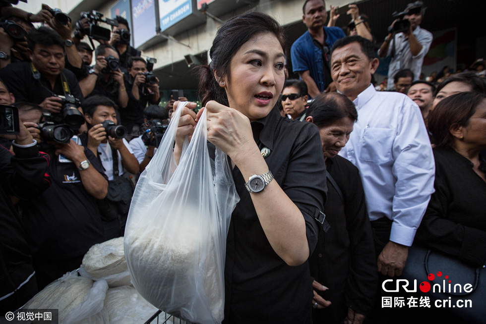 當地時間2016年11月11日,泰國曼谷,因米價下跌農民大受打擊,泰國前總理英拉現身街頭親自幫助米農賣大米,聲援米農。圖片來源:視覺中國