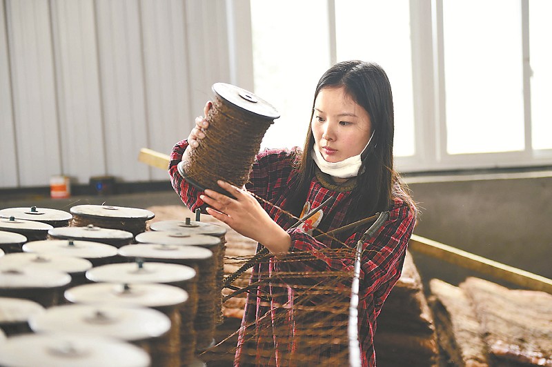 12月3日,王英在編制棕床墊的機器上裝棕線團。