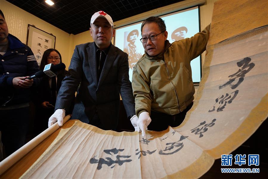 12月8日,南京民間抗日戰爭博物館館長吳先斌(右二)、谷壽夫手書捐贈者余戈(右一)在發佈會上展示並介紹谷壽夫手書《勇躍破南京城》卷軸條幅。