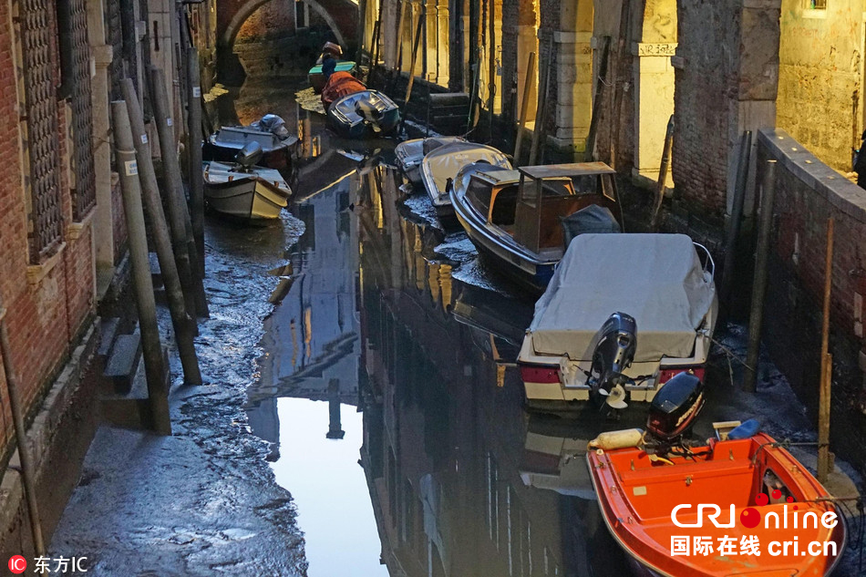當地時間2016年12月29日,意大利威尼斯,由於罕見“低潮”,“水城”威尼斯的海平面降至低點,引發缺水問題,使得不少河道河床暴露,導致主要交通工具貢多拉船陷在淤泥中。圖片來源:東方IC