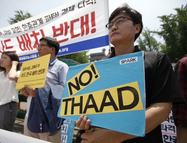 資料圖片:韓國市民團體高舉標語反對韓美在韓部署“薩德”系統。新華社記者姚琪琳攝