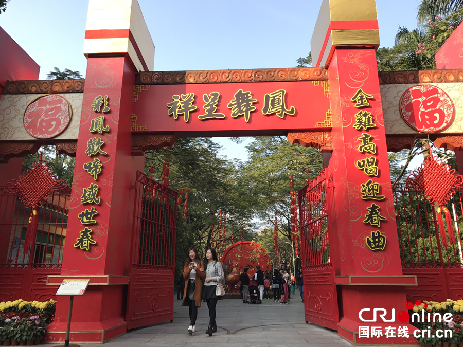 國際在線消息(記者 郭丹):2017年春節期間廣州各大公園紛紛推出各種主題活動慶賀雞年新春。“金雞高唱迎春曲,彩鳳歡啼盛世春”,廣州起義烈士陵園2017年迎春花會給人們帶來了一個喜慶、熱鬧、歡樂、祥和的春節假期。本次花會以“鳳舞呈祥”為主題,以東門大道為中軸線進行精心設計布展,展現出迎春門樓、大吉大利、春色滿園、放飛夢想、古渡花香、金鳳喜歡騰六大主景,通過桃花、年桔、銀柳和色彩鮮艷的各類時花,結合生肖雞元素和燈籠等裝飾,營造鳳舞呈祥、人間增瑞、歡樂祥和的喜慶氛圍。
