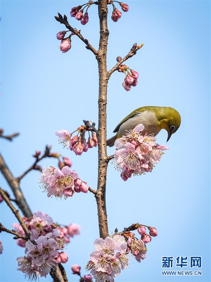 2月28日,一隻繡眼鳥停在一株櫻花上。近日,天氣回暖,南京中山植物園內櫻花盛開。鳥兒與櫻花構成春日美景,吸引不少攝影愛好者前來拍照。 新華社記者楊磊 攝