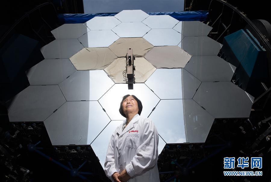 這是在中科院國家天文臺興隆觀測站拍攝的崔向群代表。背後是她參與設計建造的郭守敬望遠鏡(LAMOST)的反射面板(2014年6月14日攝)。新華社記者 金立旺 攝
