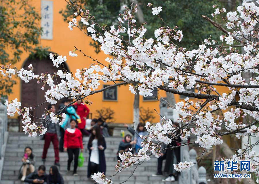 3月18日,遊客在南京雞鳴寺觀賞櫻花。時值南京雞鳴寺櫻花初綻後的首個雙休日,無邊花海吸引了大批市民和遊客前來賞櫻拍照。 新華社發(蘇陽 攝)