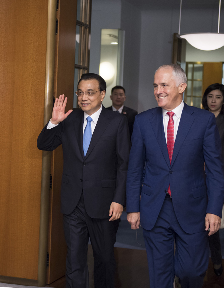 3月24日,國務院總理李克強與澳大利亞總理特恩布爾在堪培拉議會大廈,共同見證了中澳兩國八份合作文件的簽署,內容涉及中澳自貿協定、經貿投資、檢驗檢疫、氣候變化、農業、文化、教育等諸多領域。