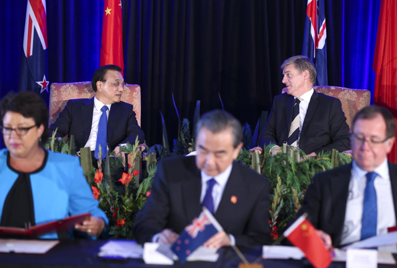 27日上午,李克強總理和新西蘭總理英格利希在惠靈頓會談後,共同見證了兩國關於經貿、農業、電子商務、教育、知識産權保護、環保等領域9份合作協議的簽署,其中包括中新關於“一帶一路”合作的諒解備忘錄,新西蘭成為首個同中國簽署此類協議的西方發達國家。