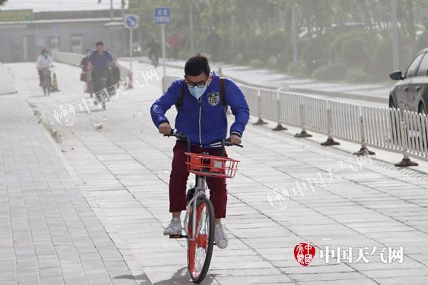 5日,市民頂風騎車,強風使局部地區出現揚沙。(攝影:關禺)