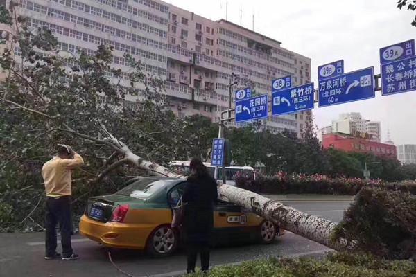 5日清晨,北三環楊樹被狂風刮倒,一齣租車被砸。(微博網友供圖)