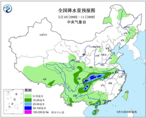 10日08時至11日08時,西南地區東部、江漢南部、江淮西部、華南南部等地有中到大雨,其中重慶南部和東北部、貴州北部、湖北西部等地的部分地區暴雨(50-80mm),局地有大暴雨(100-120毫米);上述地區局部並伴有短時強降水、雷暴大風等強對流天氣;黃淮東部的局部地區有陣性降雨和強對流天氣。內蒙古西部有4~6級風,局地伴有揚沙天氣。