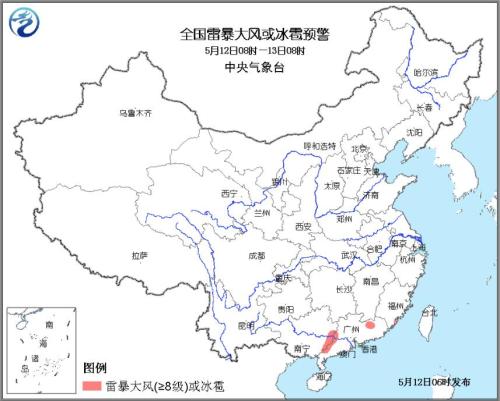中新網5月12日電 據中央氣象臺網站消息,中央氣象臺5月12日06時繼續發佈強對流天氣藍色預警,預計5月12日08時至13日08時,廣西東部、廣東北部和西部、福建東南部等地的部分地區有8-9級雷暴大風,局地伴有冰雹天氣;浙江中南部、福建、廣西東部、廣東、海南南部等地的部分地區有短時強降水,小時雨強20-40毫米,局地小時雨強超過50毫米。