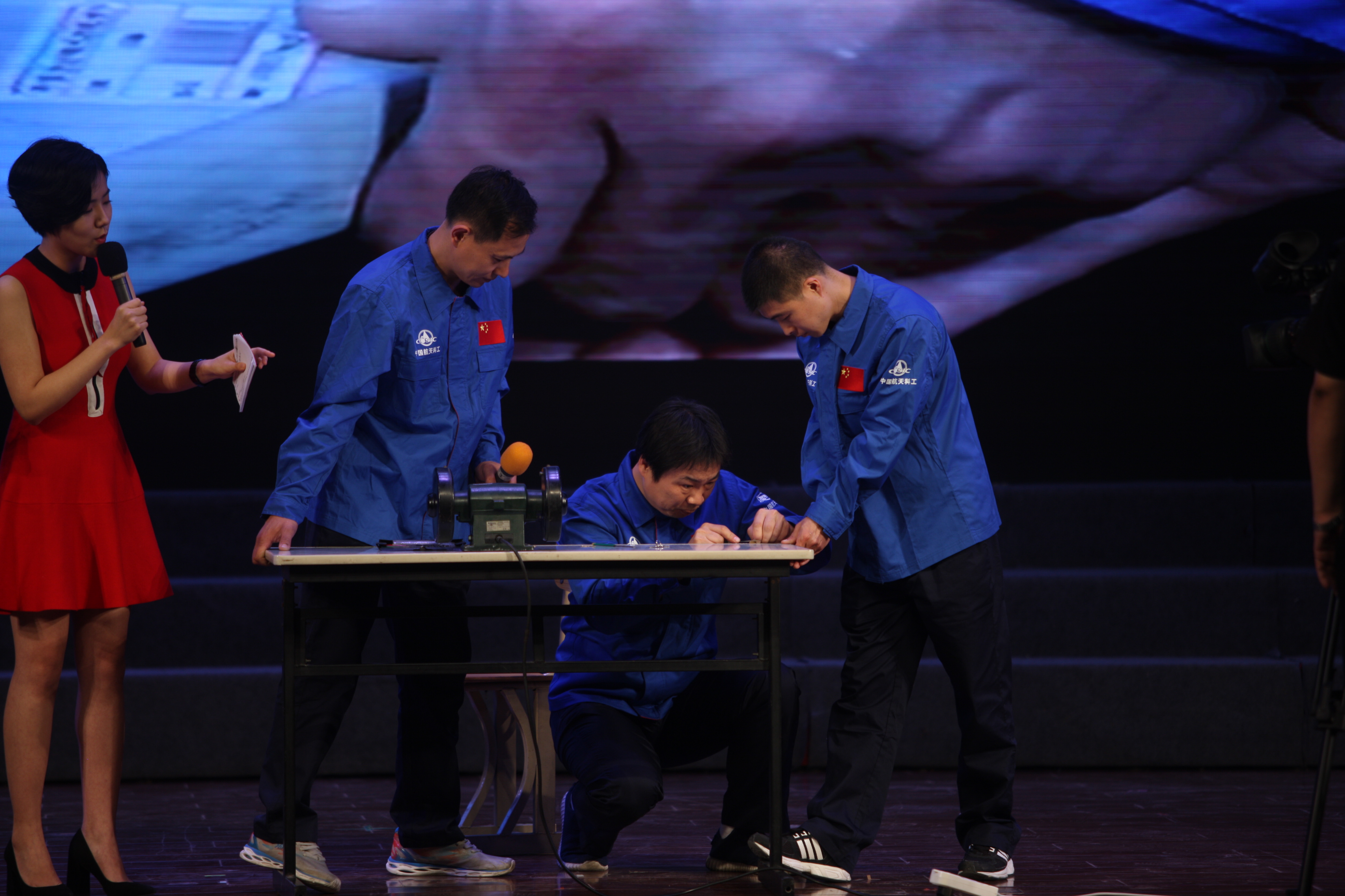 中國航天科工三院精密機械製造部鉗工、中國航天科工集團公司首席技師鞏鵬(右二)演示絕活。(全總供圖)
