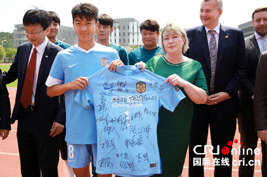 據悉,16日上午,在南京大學仙林校區體育場舉行“中捷國際青少年足球友誼賽”,中國江蘇蘇寧俱樂部和捷克布拉格斯拉維亞俱樂部青年隊代表中捷兩國參賽。雙方球員在賽後得到捷克總統親切會見。