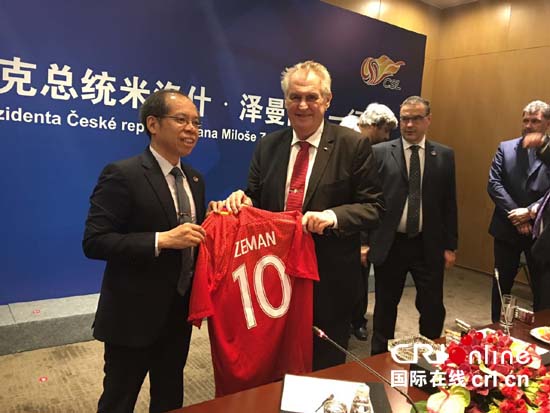 張劍隨後向捷克總統米洛什·澤曼贈送了印有其名字的中國國家隊10號球衣。