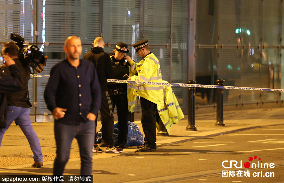 資料圖:當地時間2017年5月22日,英國曼徹斯特,英國曼徹斯特體育場發生爆炸後,警方迅速封鎖現場。圖片來源:sipa